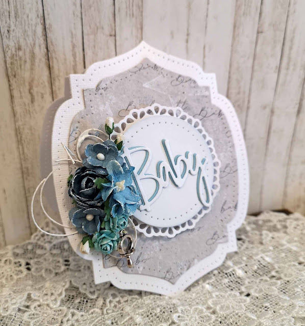 Disse babyarkene er så vakre, så duse og fine farger som går ton i ton. Dåpskjolen har jeg klippet ut på frihånd og har brukt et lyserosa ark som base. Jeg har kledd kjolen med en blonde jeg hadde liggende, og på overdelen av kjolen brukte jeg en prikkete embossing folder får å få litt effekt.